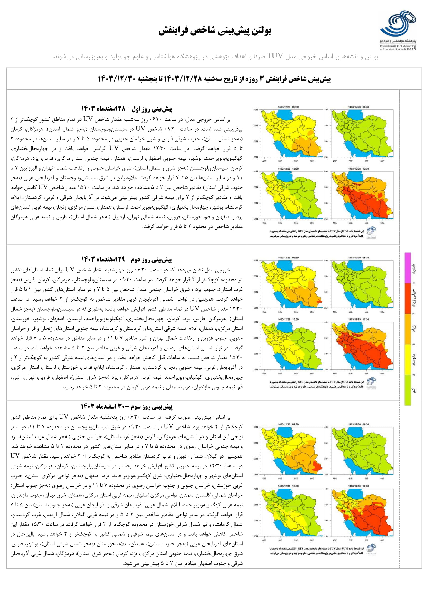 بولتن شماره ۱۷۴ پیش بینی شاخص پرتو فرابنفش ۳ روزه از تاریخ ۲۸ تا ۳۰ اسفند ماه ۱۴۰۳ ۲۸ اسفند ۱۴۰۳ | ۱۰:۲۱ کد : ۱۱۶۲ اخبـــار پژوهشگاه گزارش پیش بینی شاخص پرتو فرابنفش ارسال به دیگران نام شما ایمیل شما ایمیل دریافت کننده ارسال انصراف تعداد بازدید:۷۲