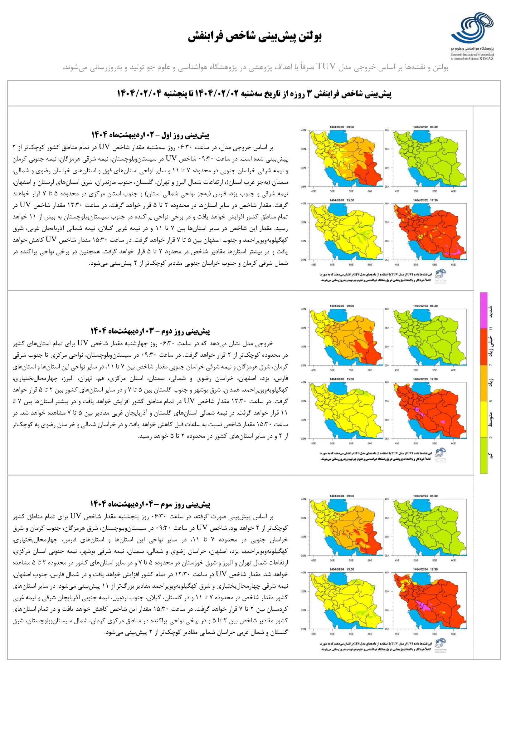 بولتن شماره ۱۸۸ پیش بینی شاخص پرتو فرابنفش ۳ روزه از تاریخ ۲ تا ۴ اردیبهشت ماه ۱۴۰۴ ۰۲ اردیبهشت ۱۴۰۴ | ۱۰:۵۸ کد : ۱۱۷۱ اخبـــار پژوهشگاه گزارش پیش بینی شاخص پرتو فرابنفش ارسال به دیگران نام شما ایمیل شما ایمیل دریافت کننده ارسال انصراف تعداد بازدید:۱۱۱