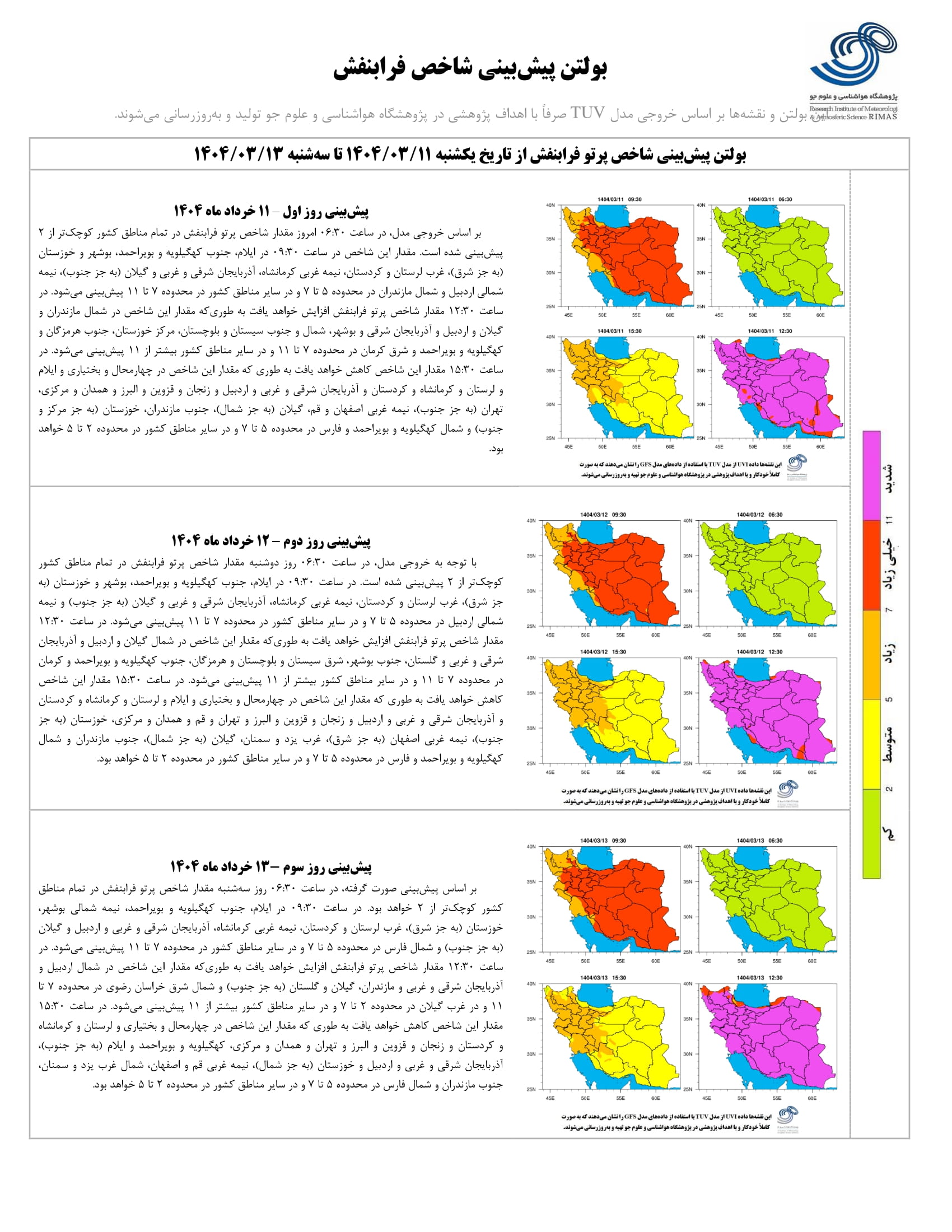 بولتن شماره ۲۱۶ پیش بینی شاخص پرتو فرابنفش ۳ روزه از تاریخ ۱۱ تا ۱۳ خرداد ماه ۱۴۰۴ ۱۱ خرداد ۱۴۰۴ | ۰۹:۰۶ کد : ۱۲۲۶ اخبـــار پژوهشگاه گزارش پیش بینی شاخص پرتو فرابنفش ارسال به دیگران نام شما ایمیل شما ایمیل دریافت کننده ارسال انصراف تعداد بازدید:۴۲