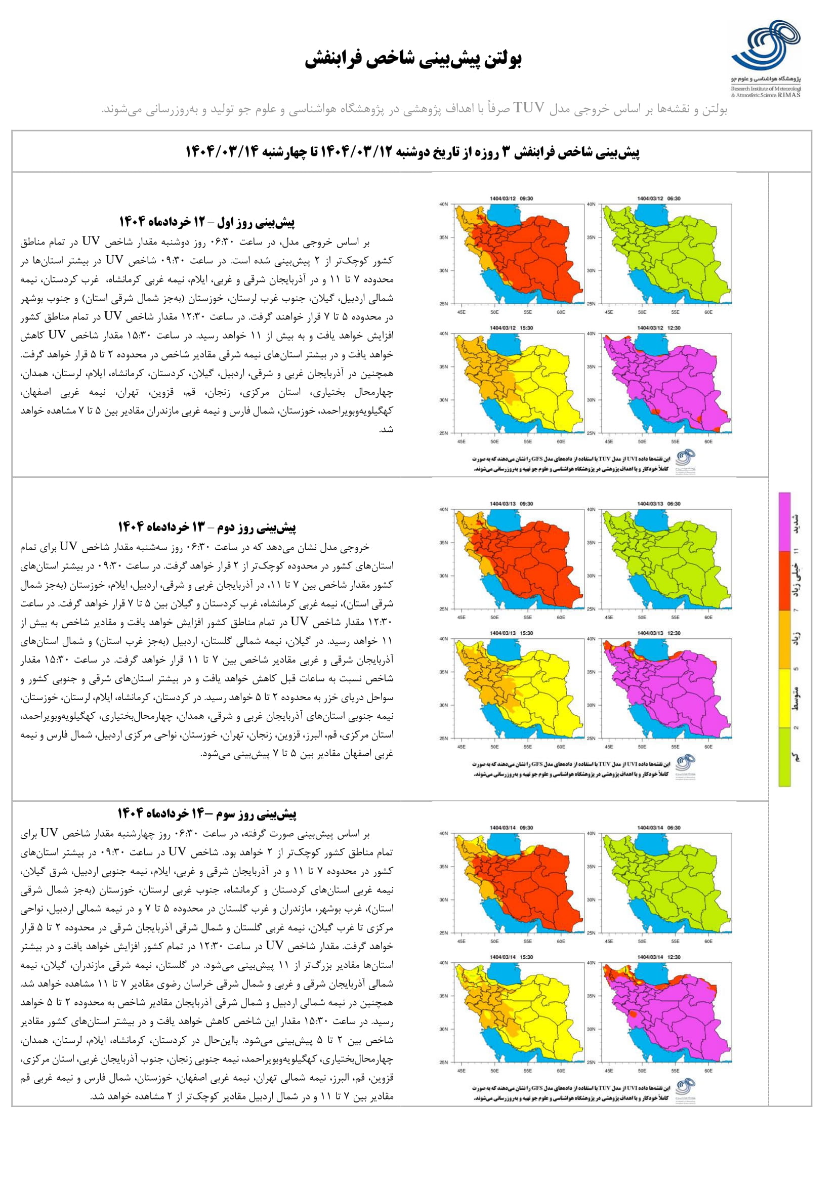 بولتن شماره ۲۱۷ پیش بینی شاخص پرتو فرابنفش ۳ روزه از تاریخ ۱۲ تا ۱۴ خرداد ماه ۱۴۰۴ ۱۲ خرداد ۱۴۰۴ | ۰۹:۰۷ کد : ۱۲۲۷ اخبـــار پژوهشگاه گزارش پیش بینی شاخص پرتو فرابنفش ارسال به دیگران نام شما ایمیل شما ایمیل دریافت کننده ارسال انصراف تعداد بازدید:۴۳