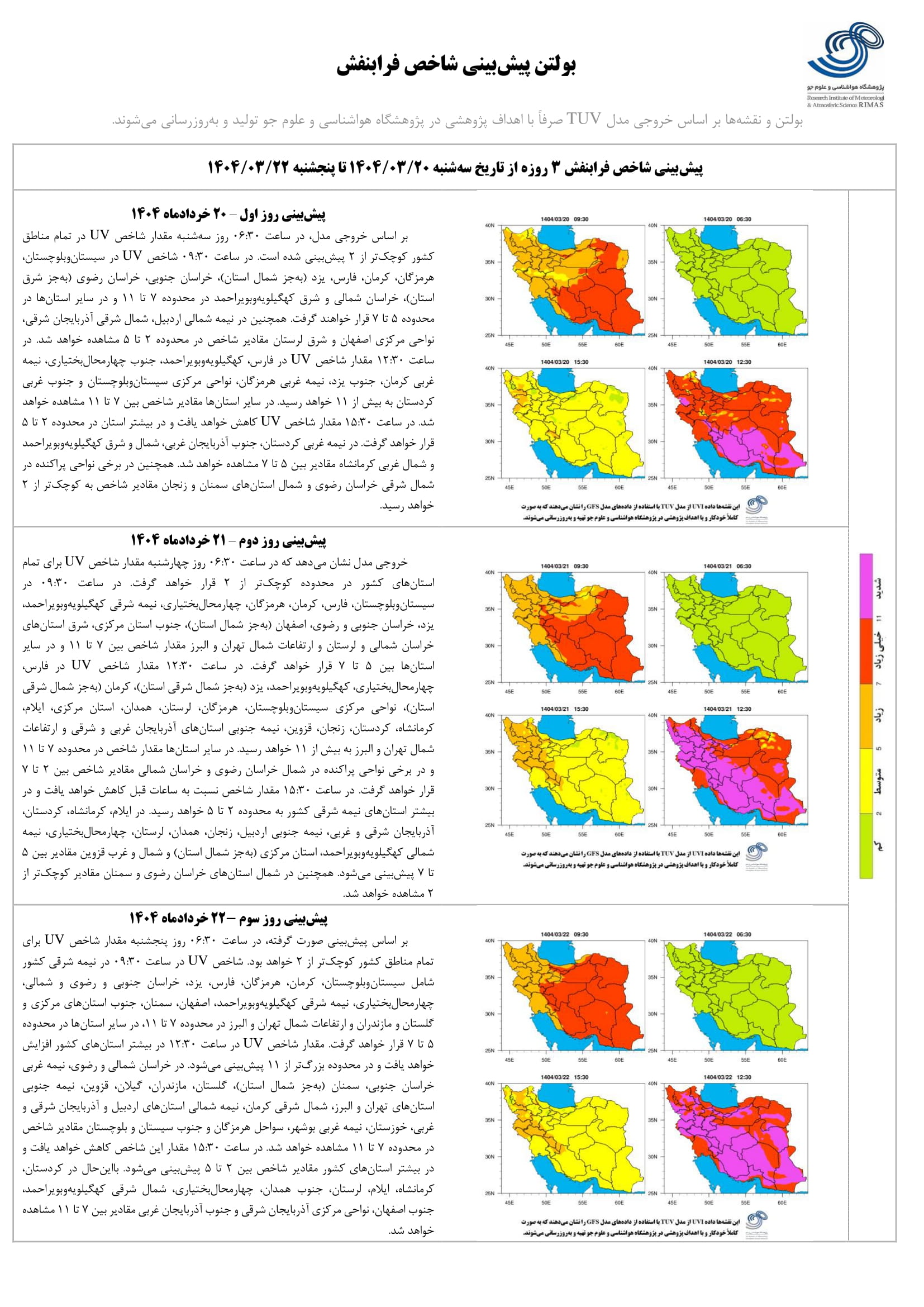 بولتن شماره ۲۲۲ پیش بینی شاخص پرتو فرابنفش ۳ روزه از تاریخ ۲۰ تا ۲۲ خرداد ماه ۱۴۰۴ ۲۰ خرداد ۱۴۰۴ | ۰۹:۱۸ کد : ۱۲۳۳ اخبـــار پژوهشگاه گزارش پیش بینی شاخص پرتو فرابنفش ارسال به دیگران نام شما ایمیل شما ایمیل دریافت کننده ارسال انصراف تعداد بازدید:۵۱