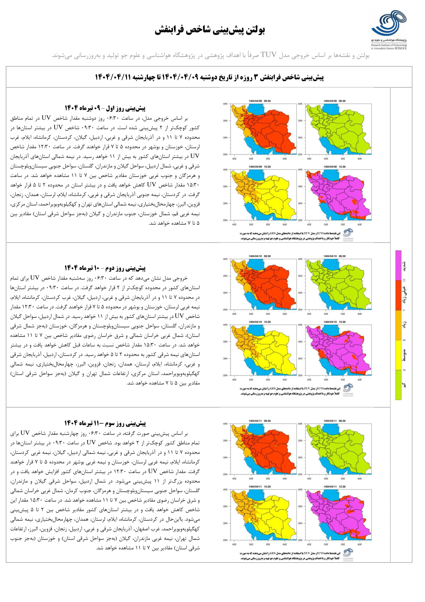 بولتن شماره ۲۲۹ پیش بینی شاخص پرتو فرابنفش ۳ روزه از تاریخ ۹ تا ۱۱ تیر ماه ۱۴۰۴ ۰۹ تیر ۱۴۰۴ | ۱۱:۲۷ کد : ۱۲۴۷ اخبـــار پژوهشگاه گزارش پیش بینی شاخص پرتو فرابنفش ارسال به دیگران نام شما ایمیل شما ایمیل دریافت کننده ارسال انصراف تعداد بازدید:۶۹