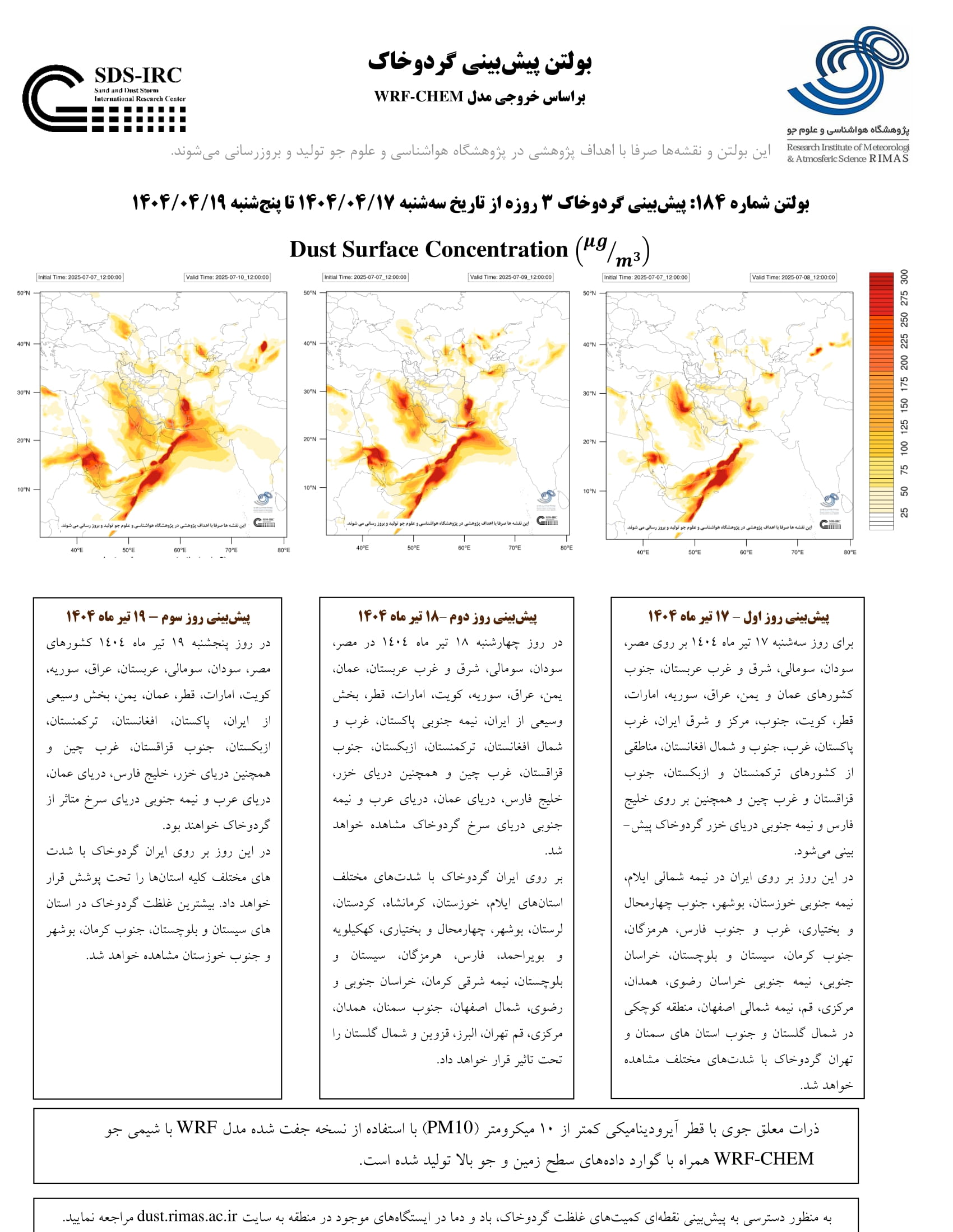 بولتن شماره ۱۸۴ پیش بینی گردوخاک ۳ روزه از تاریخ ۱۷ تا ۱۹ تیر ماه ۱۴۰۴ ۱۷ تیر ۱۴۰۴ | ۱۵:۰۸ کد : ۱۲۶۷ اخبـــار پژوهشگاه گزارش پیش بینی گردوخاک ایران و کشورهای همسایه ارسال به دیگران نام شما ایمیل شما ایمیل دریافت کننده ارسال انصراف تعداد بازدید:۷۳