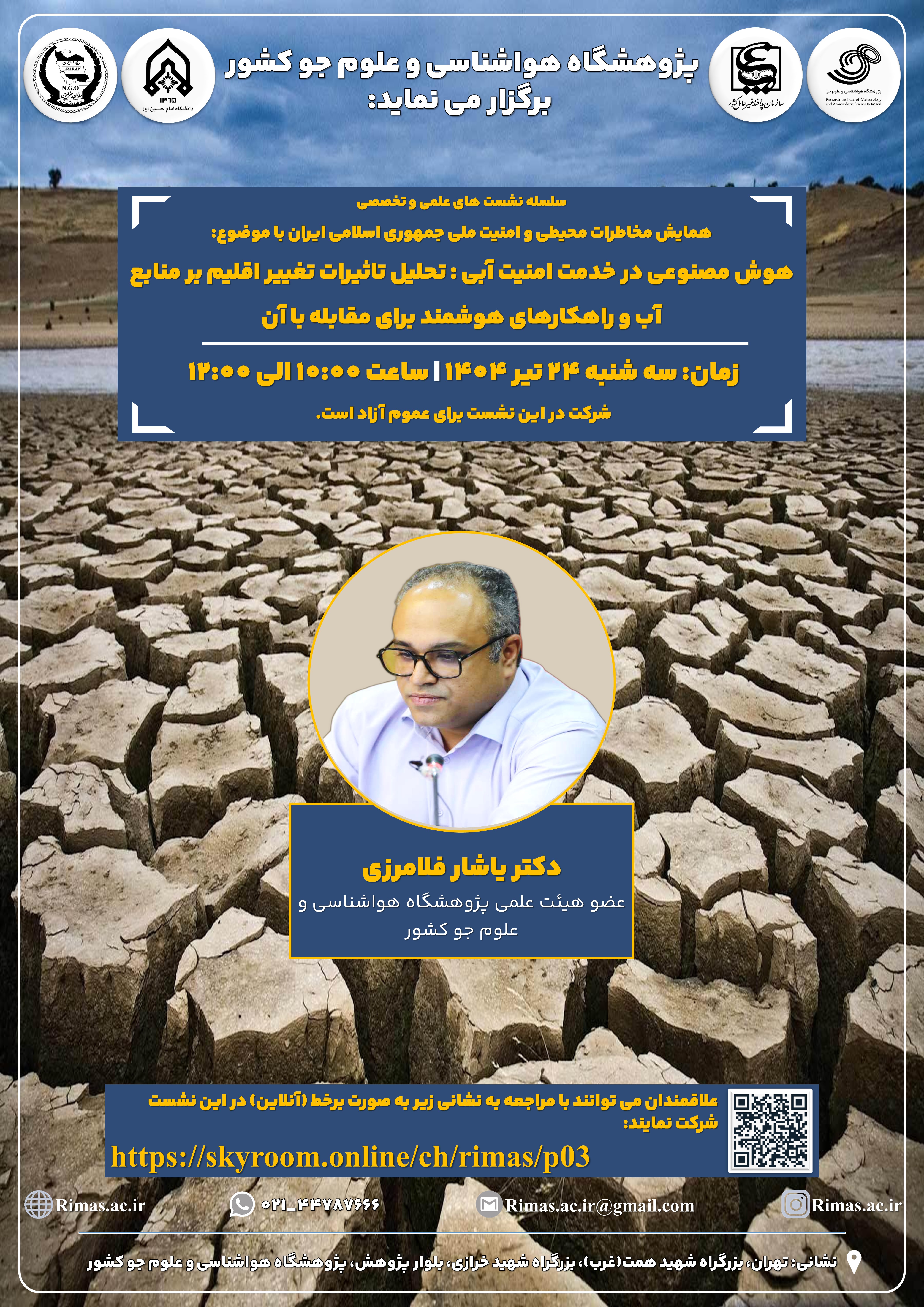 به گزارش روابط عمومی پژوهشگاه هواشناسی و علوم جو کشور، در راستای برگزاری سلسله نشست های علمی و تخصصی همایش ملی مخاطرات محیطی و امنیت ملی جمهوری اسلامی ایران، پژوهشگاه هواشناسی و علوم جو کشور با همکاری سازمان پدافند غیرعامل کشور، سازمان جغرافیایی نیروهای مسلح و دانشگاه امام حسین (ع)، نشست علمی و تخصصی با موضوع " هوش مصنوعی در خدمت امنیت آبی: تحلیل تاثیرات تغییر اقلیم بر منابع آب و راهکارهای هوشمند برای مقابله با آن" را برگزار می کند.