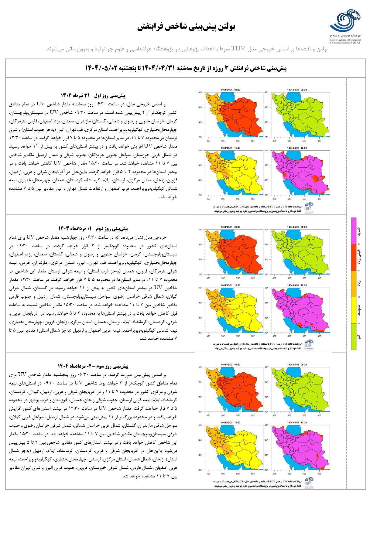بولتن شماره ۲۴۳ پیش بینی شاخص پرتو فرابنفش ۳ روزه از تاریخ ۳۱ تیر ماه تا ۲ مرداد ماه ۱۴۰۴ ۳۱ تیر ۱۴۰۴ | ۰۸:۲۷ کد : ۱۳۰۰ اخبـــار پژوهشگاه گزارش پیش بینی شاخص پرتو فرابنفش ارسال به دیگران نام شما ایمیل شما ایمیل دریافت کننده ارسال انصراف تعداد بازدید:۴۰