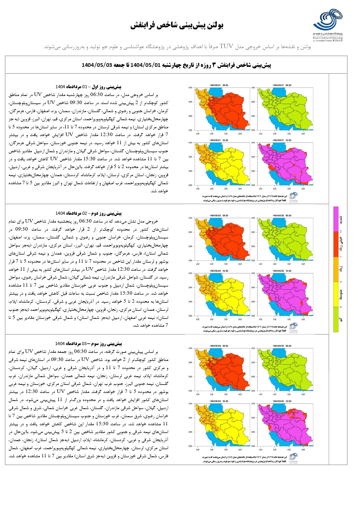 بولتن شماره ۲۴۴ پیش بینی شاخص پرتو فرابنفش ۳ روزه از تاریخ ۱ تا ۳ مرداد ماه ۱۴۰۴ ۰۱ مرداد ۱۴۰۴ | ۰۸:۳۸ کد : ۱۳۰۲ اخبـــار پژوهشگاه گزارش پیش بینی شاخص پرتو فرابنفش ارسال به دیگران نام شما ایمیل شما ایمیل دریافت کننده ارسال انصراف تعداد بازدید:۵۵
