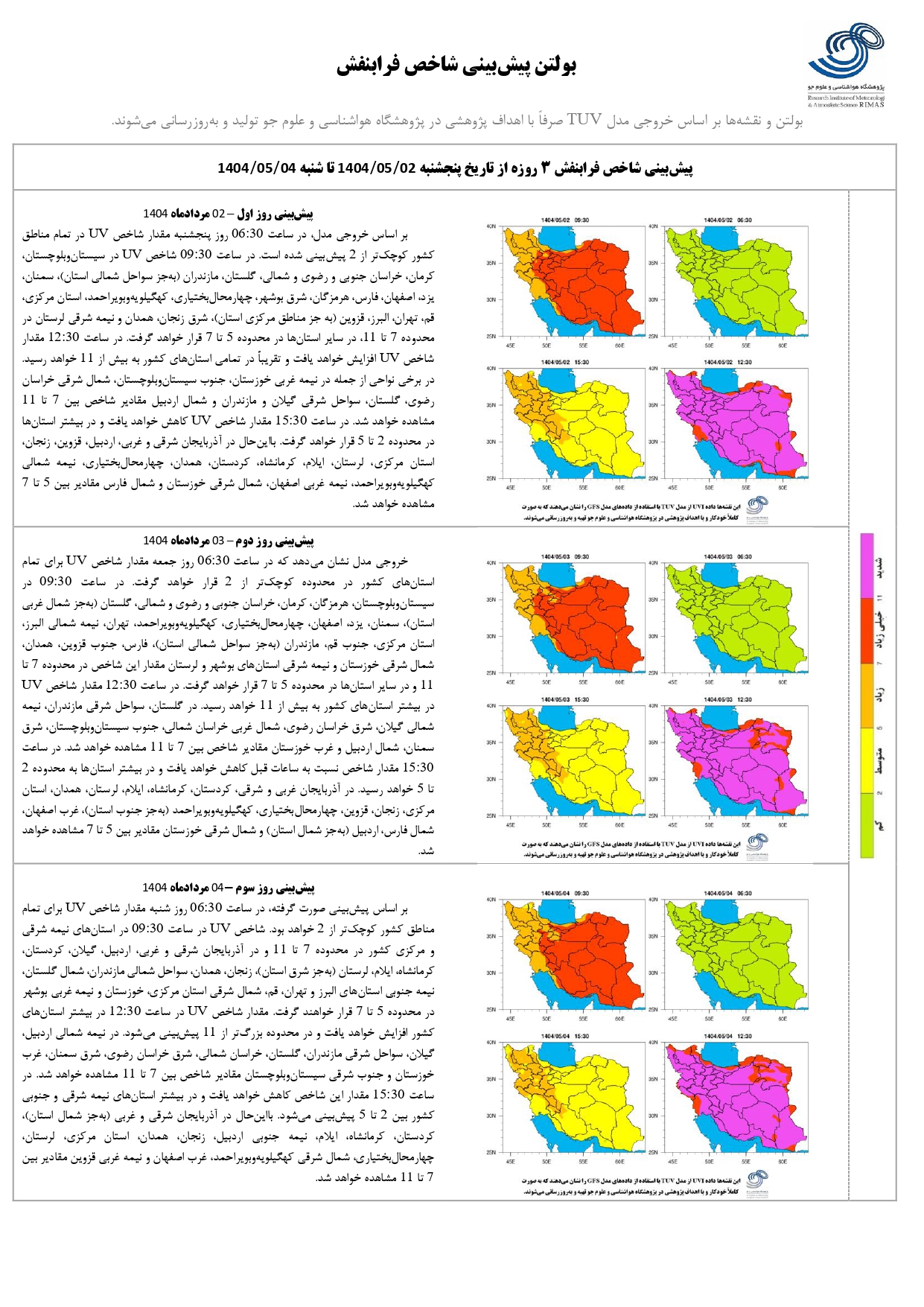 بولتن شماره ۲۴۵ پیش بینی شاخص پرتو فرابنفش ۳ روزه از تاریخ ۲ تا ۴ مرداد ماه ۱۴۰۴ ۰۲ مرداد ۱۴۰۴ | ۱۰:۳۳ کد : ۱۳۰۵ اخبـــار پژوهشگاه گزارش پیش بینی شاخص پرتو فرابنفش ارسال به دیگران نام شما ایمیل شما ایمیل دریافت کننده ارسال انصراف تعداد بازدید:۷۴
