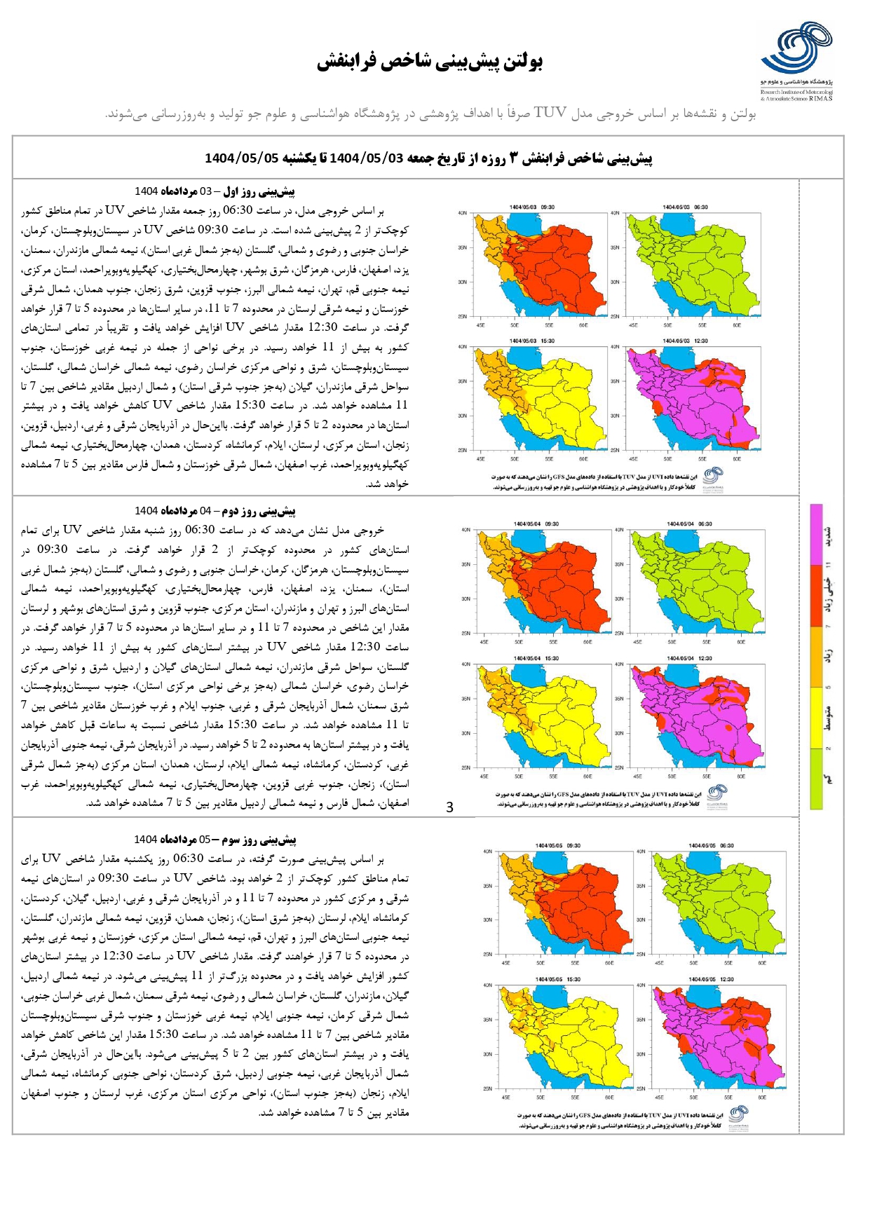 بولتن شماره ۲۴۶ پیش بینی شاخص پرتو فرابنفش ۳ روزه از تاریخ ۳ تا ۵ مرداد ماه ۱۴۰۴ ۰۳ مرداد ۱۴۰۴ | ۱۱:۰۶ کد : ۱۳۰۸ اخبـــار پژوهشگاه گزارش پیش بینی شاخص پرتو فرابنفش ارسال به دیگران نام شما ایمیل شما ایمیل دریافت کننده ارسال انصراف تعداد بازدید:۶۲