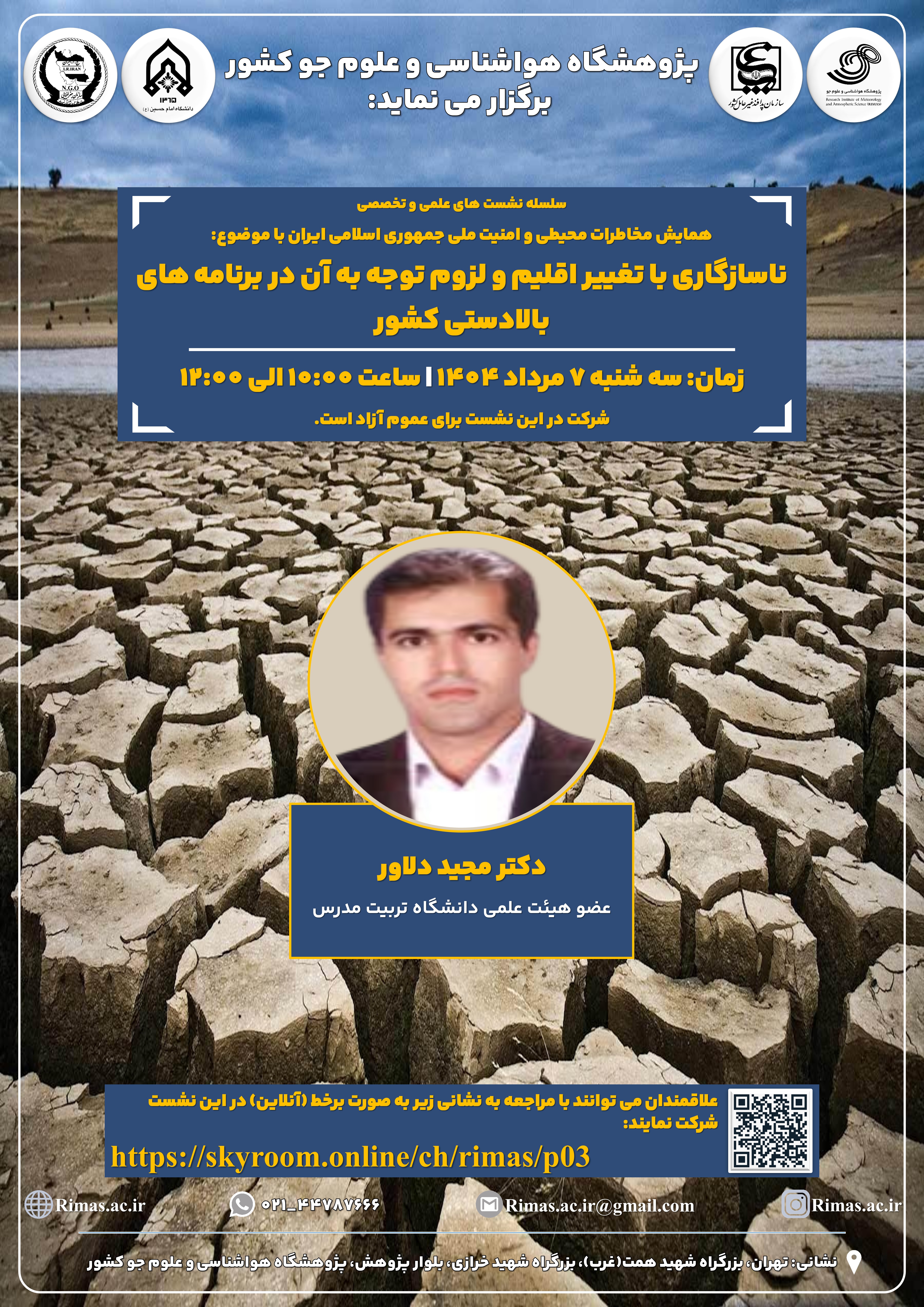 به گزارش روابط عمومی پژوهشگاه هواشناسی و علوم جو کشور، در راستای برگزاری سلسله نشست های علمی و تخصصی همایش ملی مخاطرات محیطی و امنیت ملی جمهوری اسلامی ایران، پژوهشگاه هواشناسی و علوم جو کشور با همکاری سازمان پدافند غیرعامل کشور، سازمان جغرافیایی نیروهای مسلح و دانشگاه امام حسین (ع)، نشست علمی و تخصصی با موضوع "ناسازگاری با تغییر اقلیم و لزوم توجه به آن در برنامه های بالادستی کشور" را برگزار می کند.