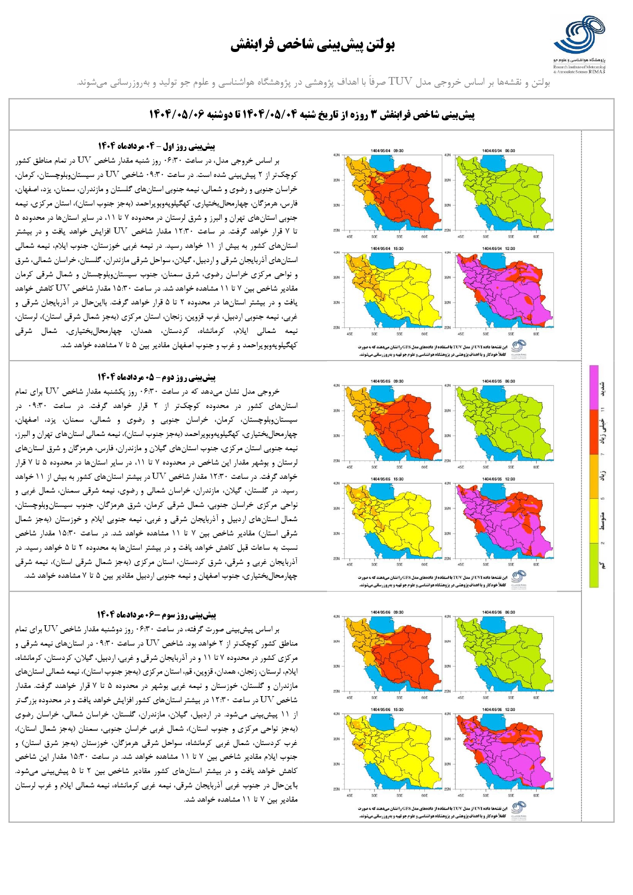 بولتن شماره ۲۴۷ پیش بینی شاخص پرتو فرابنفش ۳ روزه از تاریخ ۴ تا ۶ مرداد ماه ۱۴۰۴ ۰۴ مرداد ۱۴۰۴ | ۱۲:۰۸ کد : ۱۳۱۰ اخبـــار پژوهشگاه گزارش پیش بینی شاخص پرتو فرابنفش ارسال به دیگران نام شما ایمیل شما ایمیل دریافت کننده ارسال انصراف تعداد بازدید:۵۲