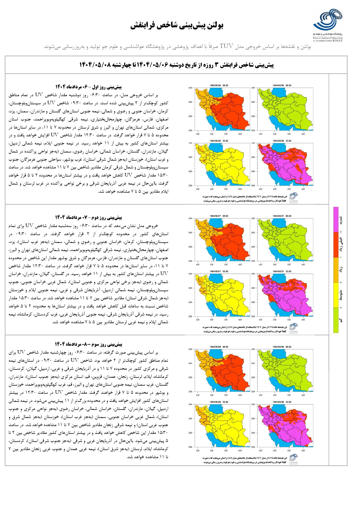 توسط پژوهشگاه هواشناسی و علوم جو کشور؛ بولتن شماره ۲۴۹ پیش بینی شاخص پرتو فرابنفش ۳ روزه از تاریخ ۶ تا ۸ مرداد ماه ۱۴۰۴ ۰۶ مرداد ۱۴۰۴ | ۰۹:۵۰ کد : ۱۳۱۸ اخبـــار پژوهشگاه گزارش پیش بینی شاخص پرتو فرابنفش ارسال به دیگران نام شما ایمیل شما ایمیل دریافت کننده ارسال انصراف تعداد بازدید:۴۸