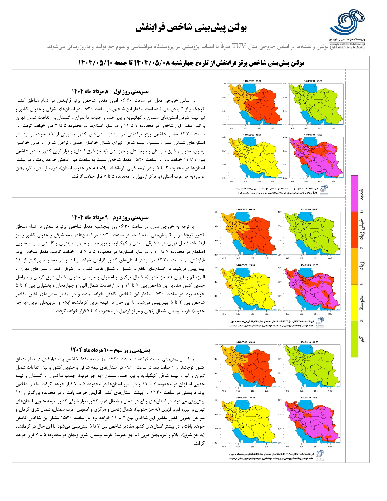 بولتن شماره ۲۵۱ پیش بینی شاخص پرتو فرابنفش ۳ روزه از تاریخ ۸ تا ۱۰ مرداد ماه ۱۴۰۴ ۰۸ مرداد ۱۴۰۴ | ۰۹:۱۸ کد : ۱۳۲۶ اخبـــار پژوهشگاه گزارش پیش بینی شاخص پرتو فرابنفش ارسال به دیگران نام شما ایمیل شما ایمیل دریافت کننده ارسال انصراف تعداد بازدید:۴۶