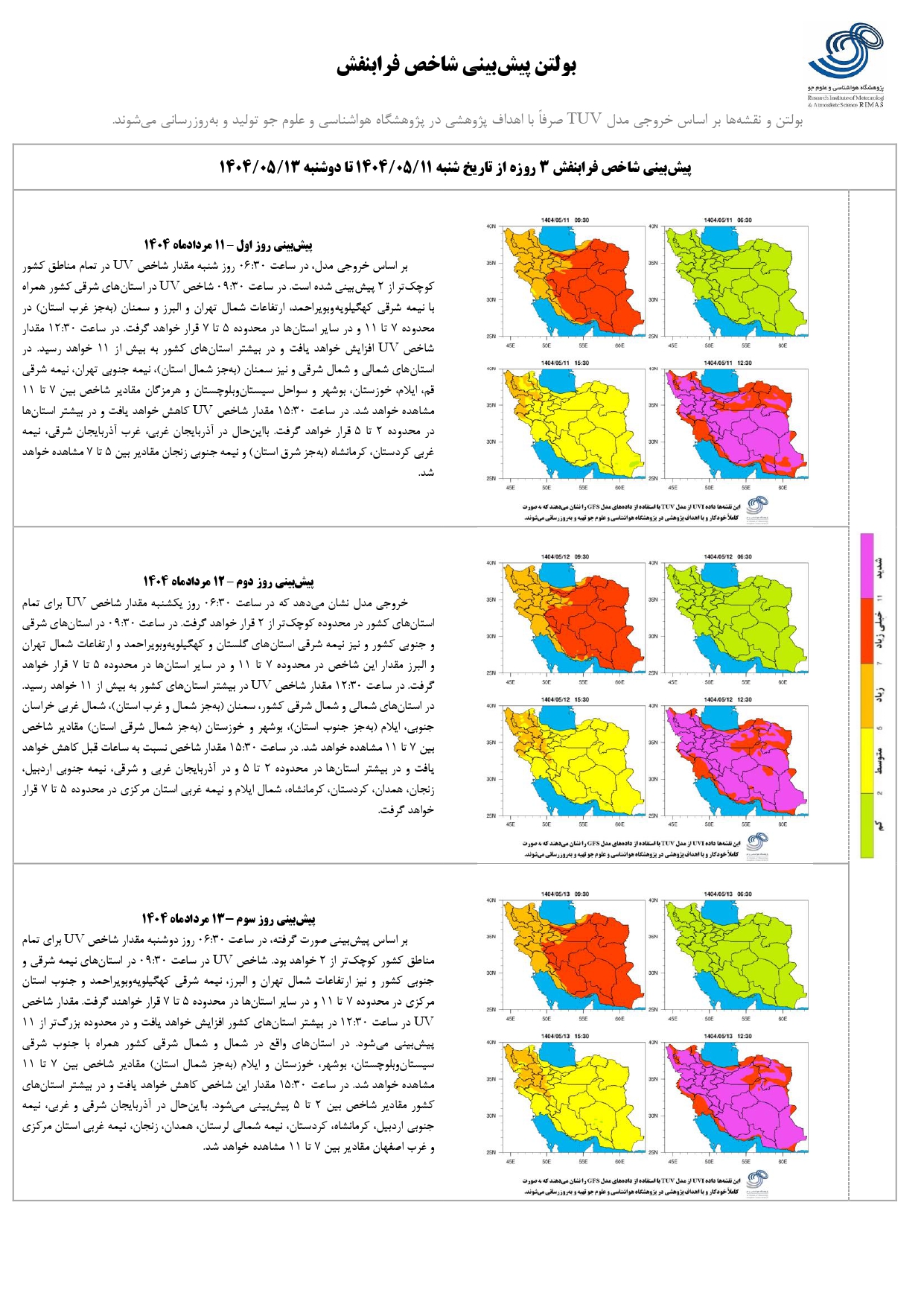 بولتن شماره ۲۵۴ پیش بینی شاخص پرتو فرابنفش ۳ روزه از تاریخ ۱۱ تا ۱۳ مرداد ماه ۱۴۰۴ ۱۱ مرداد ۱۴۰۴ | ۰۸:۵۱ کد : ۱۳۳۰ اخبـــار پژوهشگاه گزارش پیش بینی شاخص پرتو فرابنفش ارسال به دیگران نام شما ایمیل شما ایمیل دریافت کننده ارسال انصراف تعداد بازدید:۴۷