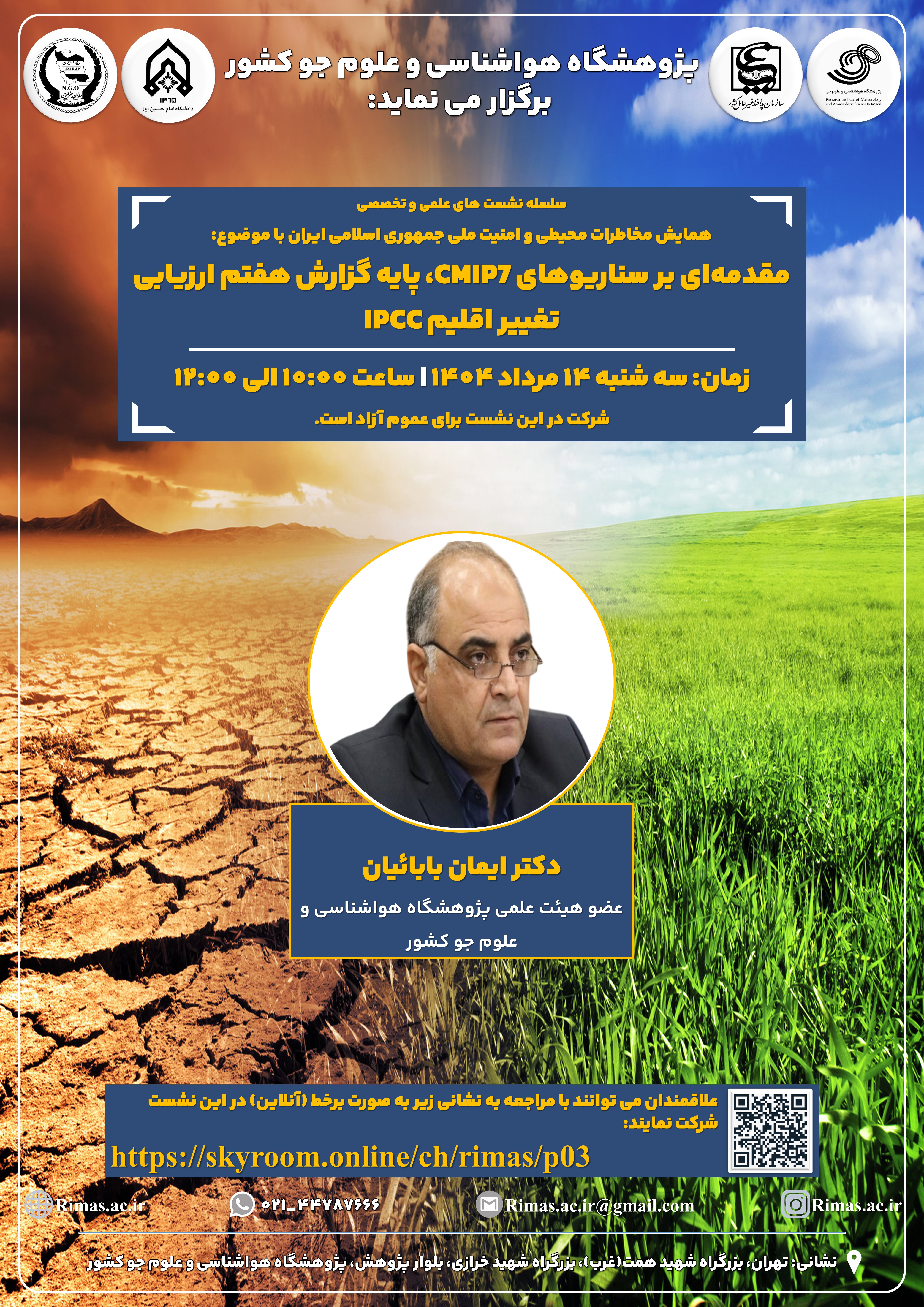 به گزارش روابط عمومی پژوهشگاه هواشناسی و علوم جو کشور، در راستای برگزاری سلسله نشست های علمی و تخصصی همایش ملی مخاطرات محیطی و امنیت ملی جمهوری اسلامی ایران، پژوهشگاه هواشناسی و علوم جو کشور با همکاری سازمان پدافند غیرعامل کشور، سازمان جغرافیایی نیروهای مسلح و دانشگاه امام حسین (ع)، نشست علمی و تخصصی با موضوع "مقدمه ای بر سناریوهای CMIP7، پایه گزارش هفتم ارزیابی تغییر اقلیم IPCC" را برگزار می کند.