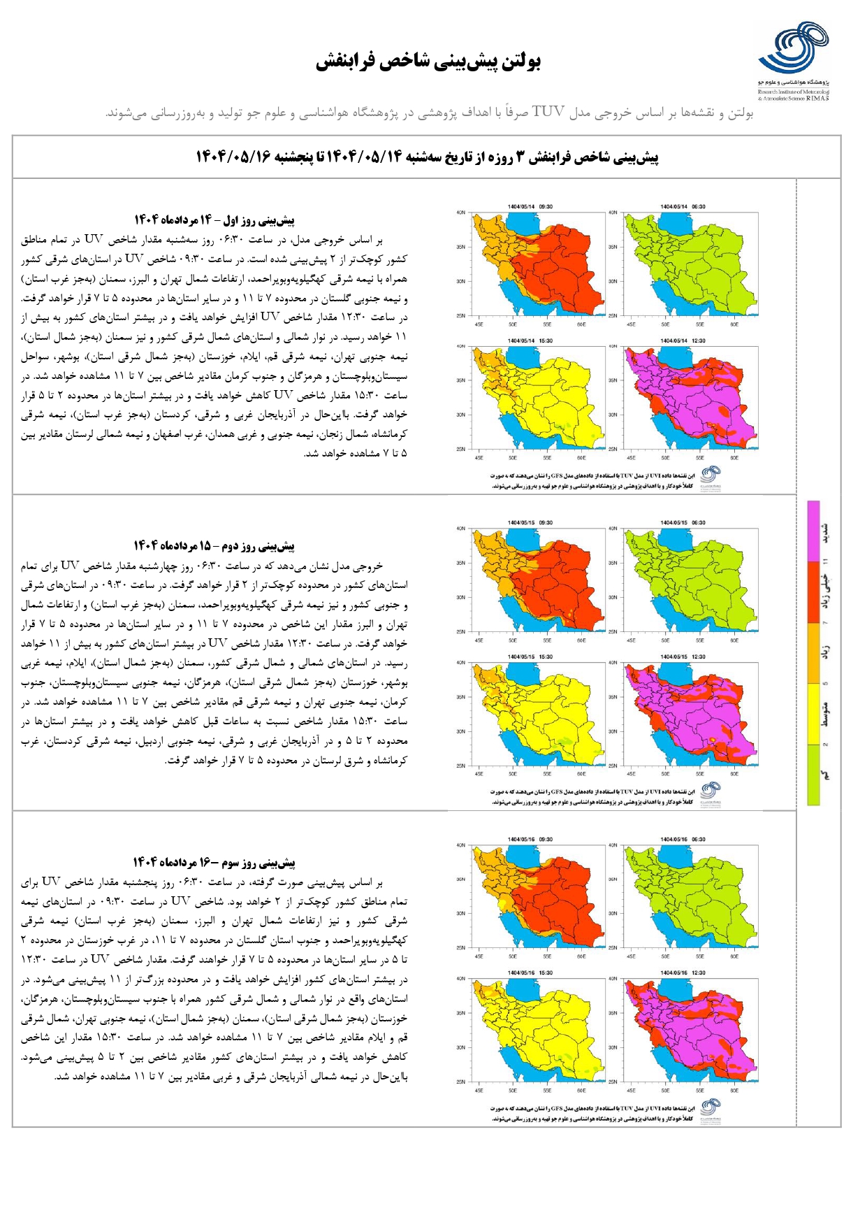 بولتن شماره ۲۵۷ پیش بینی شاخص پرتو فرابنفش ۳ روزه از تاریخ ۱۴ تا ۱۶ مرداد ماه ۱۴۰۴ ۱۴ مرداد ۱۴۰۴ | ۰۸:۵۰ کد : ۱۳۴۳ اخبـــار پژوهشگاه گزارش پیش بینی شاخص پرتو فرابنفش ارسال به دیگران نام شما ایمیل شما ایمیل دریافت کننده ارسال انصراف تعداد بازدید:۶۱