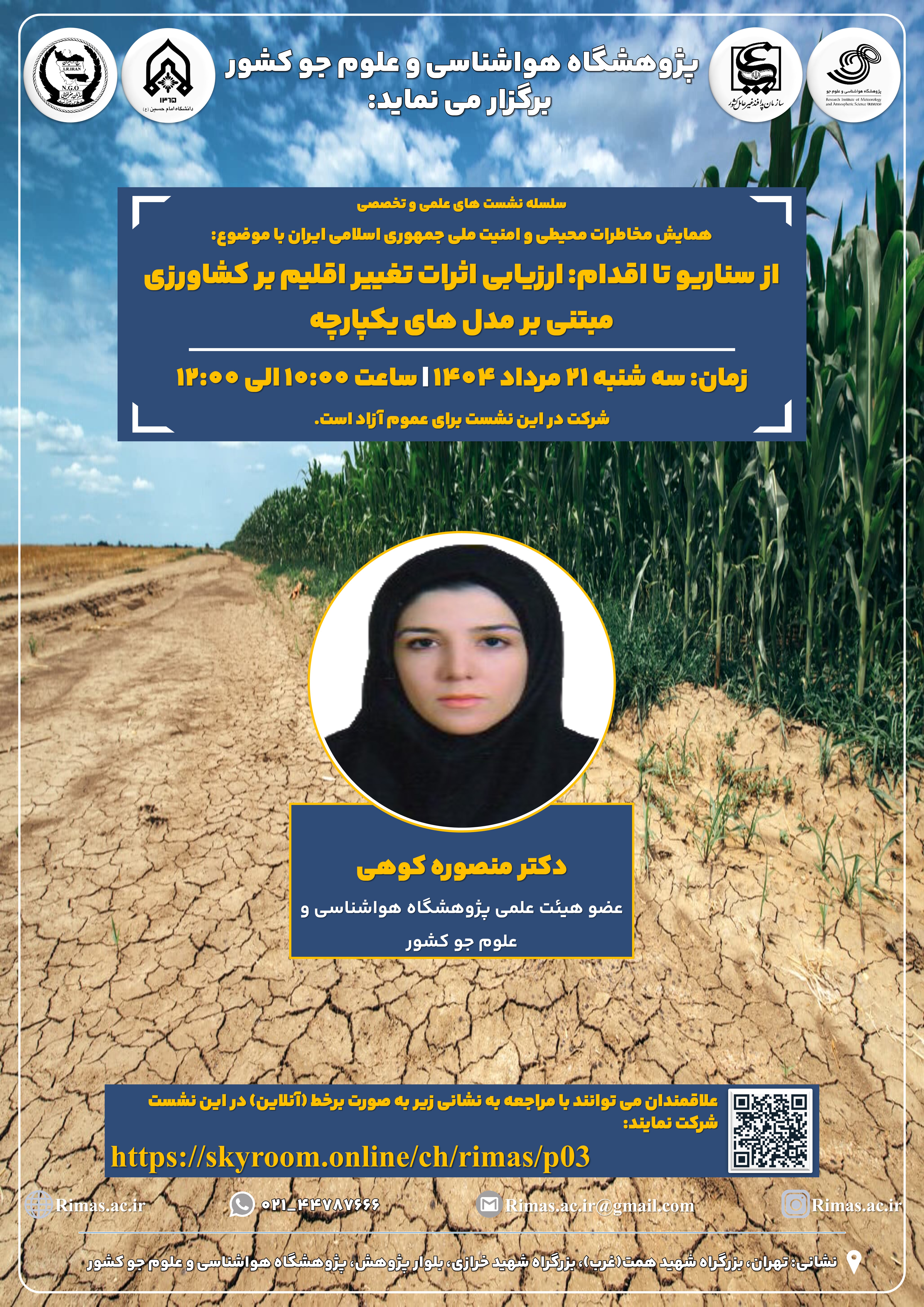 به گزارش روابط عمومی پژوهشگاه هواشناسی و علوم جو کشور، در راستای برگزاری سلسله نشست های علمی و تخصصی همایش ملی مخاطرات محیطی و امنیت ملی جمهوری اسلامی ایران، پژوهشگاه هواشناسی و علوم جو کشور با همکاری سازمان پدافند غیرعامل کشور، سازمان جغرافیایی نیروهای مسلح و دانشگاه امام حسین (ع)، ششمین نشست علمی و تخصصی با موضوع "از سناریو تا اقدام: ارزیابی اثرات تغییر اقلیم بر کشاورزی مبتنی بر مدل های یکپارچه" را برگزار می کند.