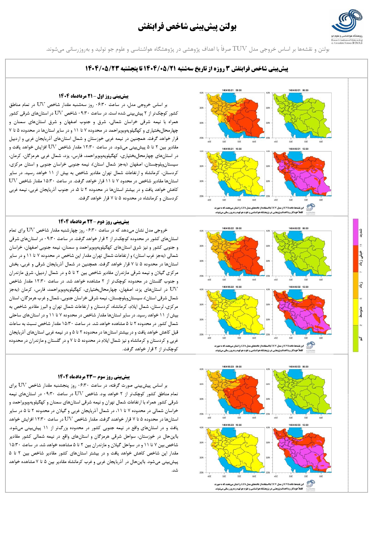 بولتن شماره ۲۶۲ پیش بینی شاخص پرتو فرابنفش ۳ روزه از تاریخ ۲۱ تا ۲۳ مرداد ماه ۱۴۰۴ ۲۱ مرداد ۱۴۰۴ | ۰۸:۵۸ کد : ۱۳۶۲ اخبـــار پژوهشگاه گزارش پیش بینی شاخص پرتو فرابنفش ارسال به دیگران نام شما ایمیل شما ایمیل دریافت کننده ارسال انصراف تعداد بازدید:۳۲