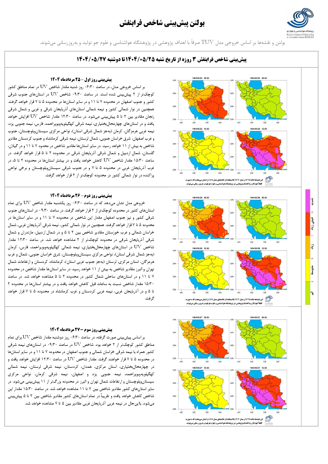 بولتن شماره ۲۶۴ پیش بینی شاخص پرتو فرابنفش ۳ روزه از تاریخ ۲۵ تا ۲۷ مرداد ماه ۱۴۰۴ ۲۵ مرداد ۱۴۰۴ | ۰۸:۳۹ کد : ۱۳۶۷ اخبـــار پژوهشگاه گزارش پیش بینی شاخص پرتو فرابنفش ارسال به دیگران نام شما ایمیل شما ایمیل دریافت کننده ارسال انصراف تعداد بازدید:۳۱