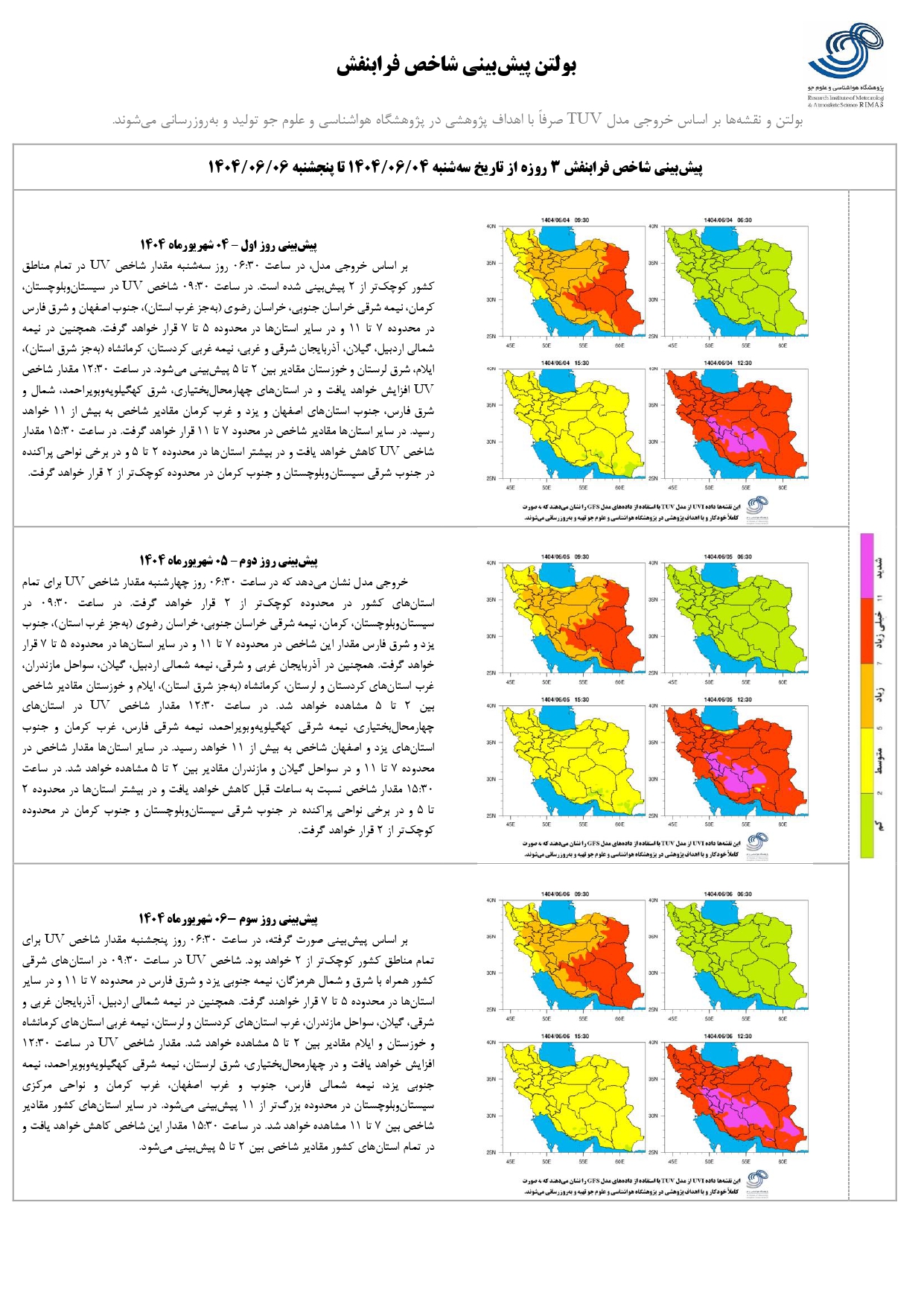 بولتن شماره ۲۷۰ پیش بینی شاخص پرتو فرابنفش ۳ روزه از تاریخ ۴ تا ۶ شهریور ماه ۱۴۰۴ ۰۴ شهریور ۱۴۰۴ | ۰۹:۵۴ کد : ۱۳۹۹ اخبـــار پژوهشگاه گزارش پیش بینی شاخص پرتو فرابنفش ارسال به دیگران نام شما ایمیل شما ایمیل دریافت کننده ارسال انصراف تعداد بازدید:۲۴
