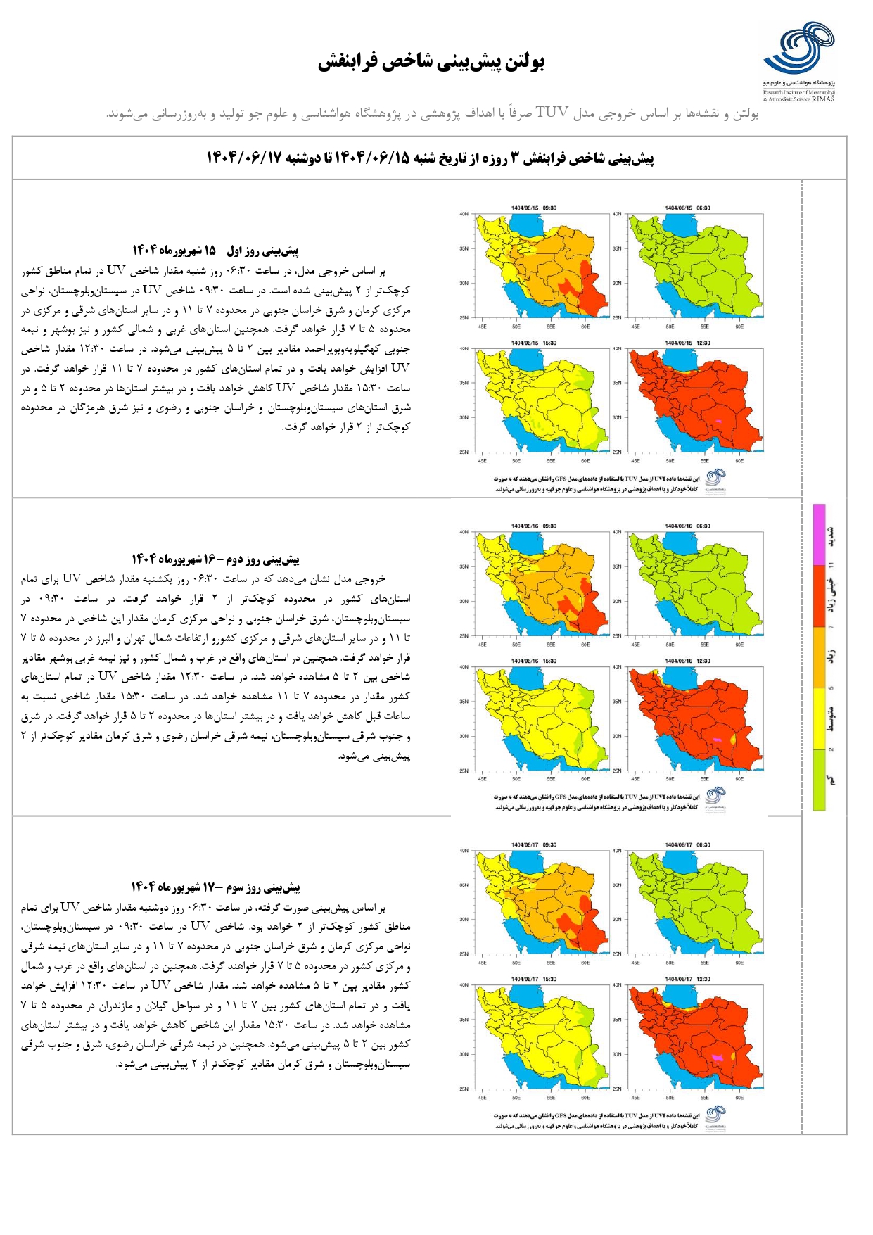 بولتن شماره ۲۷۶ پیش بینی شاخص پرتو فرابنفش ۳ روزه از تاریخ ۱۵ تا ۱۷ شهریور ماه ۱۴۰۴ ۱۵ شهریور ۱۴۰۴ | ۱۳:۲۹ کد : ۱۴۲۴ اخبـــار پژوهشگاه گزارش پیش بینی شاخص پرتو فرابنفش ارسال به دیگران نام شما ایمیل شما ایمیل دریافت کننده ارسال انصراف تعداد بازدید:۳۳