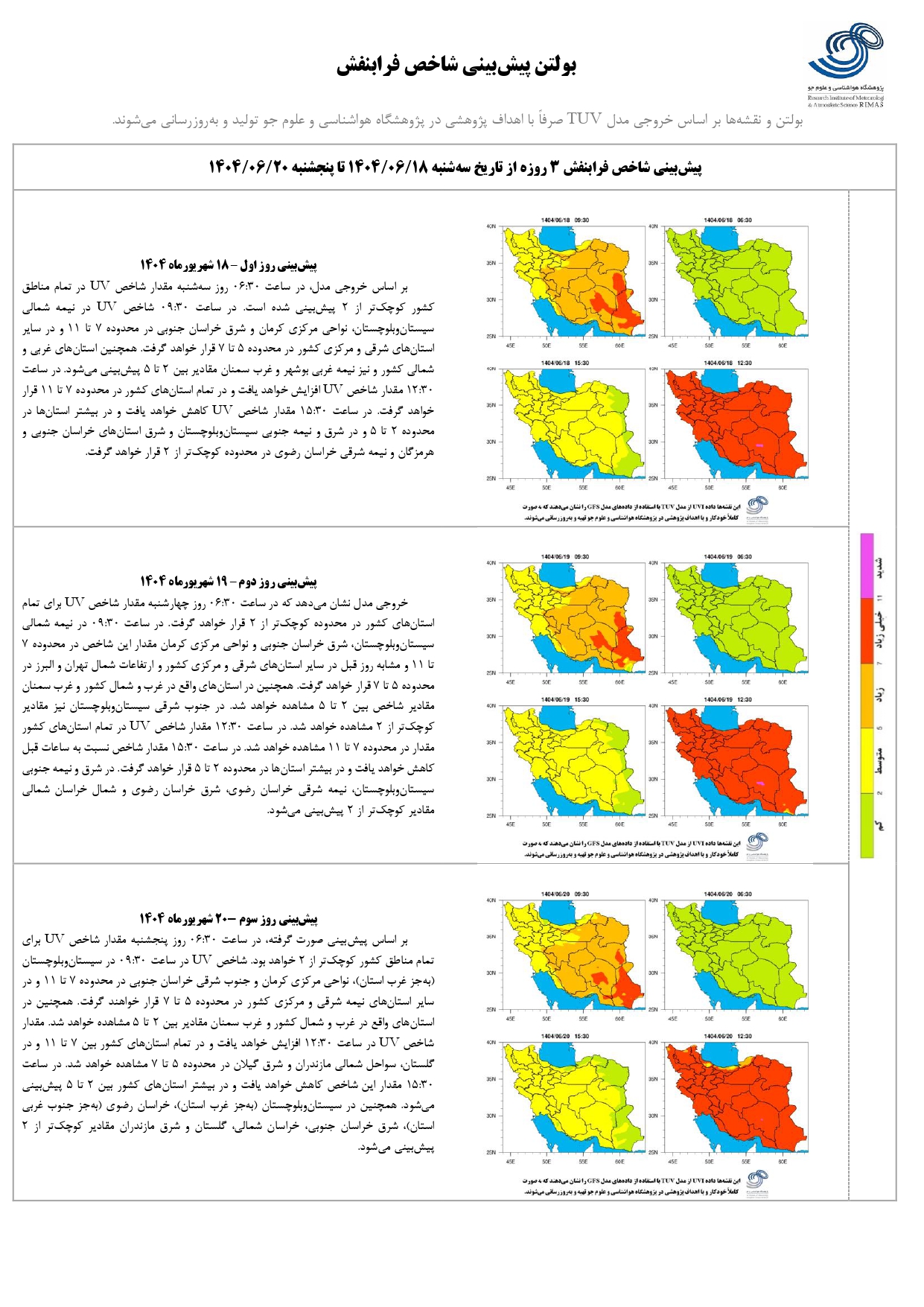 بولتن شماره ۲۷۹ پیش بینی شاخص پرتو فرابنفش ۳ روزه از تاریخ ۱۸ تا ۲۰ شهریور ماه ۱۴۰۴ ۱۸ شهریور ۱۴۰۴ | ۰۸:۲۳ کد : ۱۴۳۲ اخبـــار پژوهشگاه گزارش پیش بینی شاخص پرتو فرابنفش ارسال به دیگران نام شما ایمیل شما ایمیل دریافت کننده ارسال انصراف تعداد بازدید:۲۶