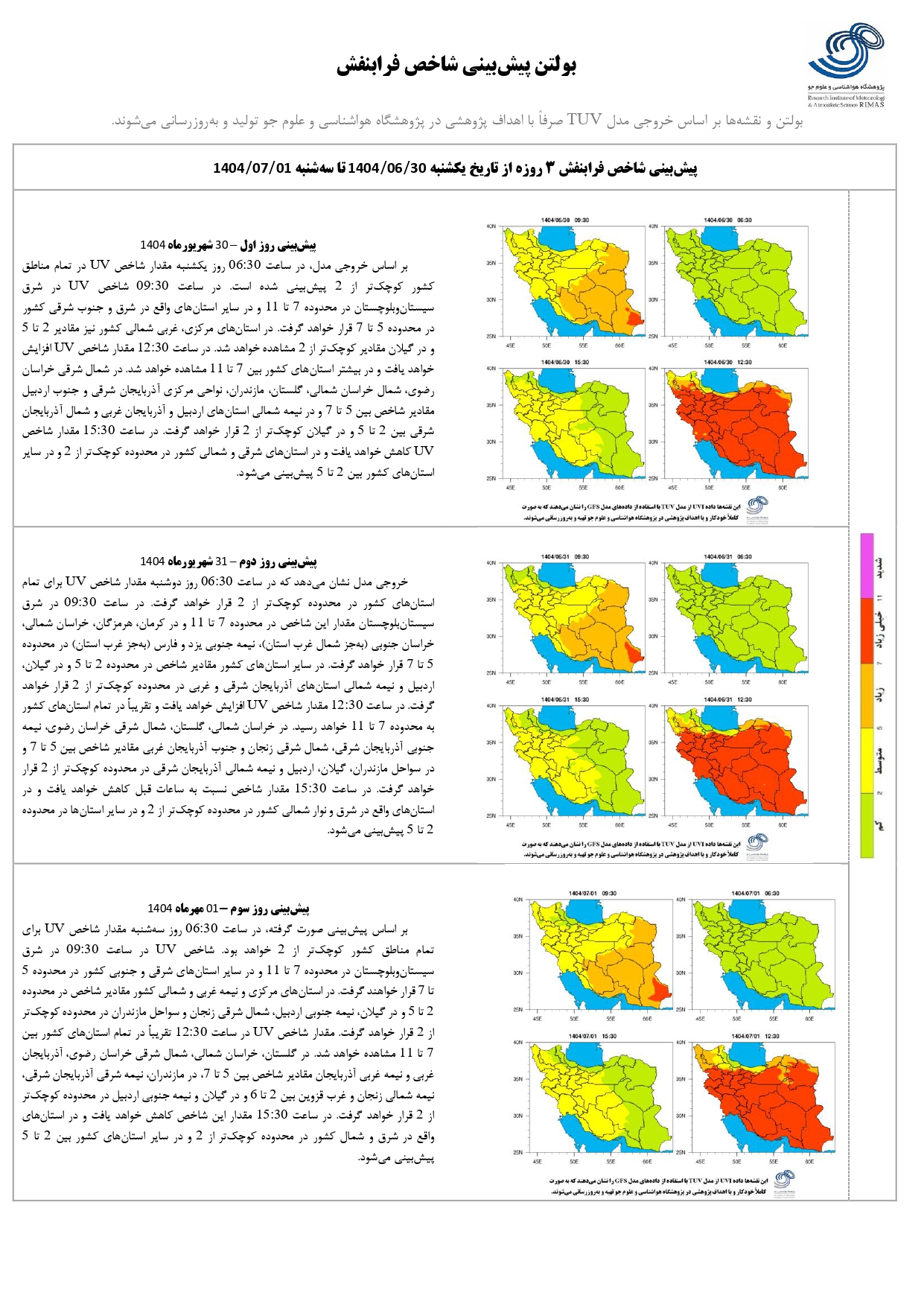بولتن شماره ۲۸۶ پیش بینی شاخص پرتو فرابنفش ۳ روزه از تاریخ ۳۰ شهریور ماه تا اول مهر ماه ۱۴۰۴ ۳۰ شهریور ۱۴۰۴ | ۰۸:۴۵ کد : ۱۴۵۱ اخبـــار پژوهشگاه گزارش پیش بینی شاخص پرتو فرابنفش ارسال به دیگران نام شما ایمیل شما ایمیل دریافت کننده ارسال انصراف تعداد بازدید:۲۳