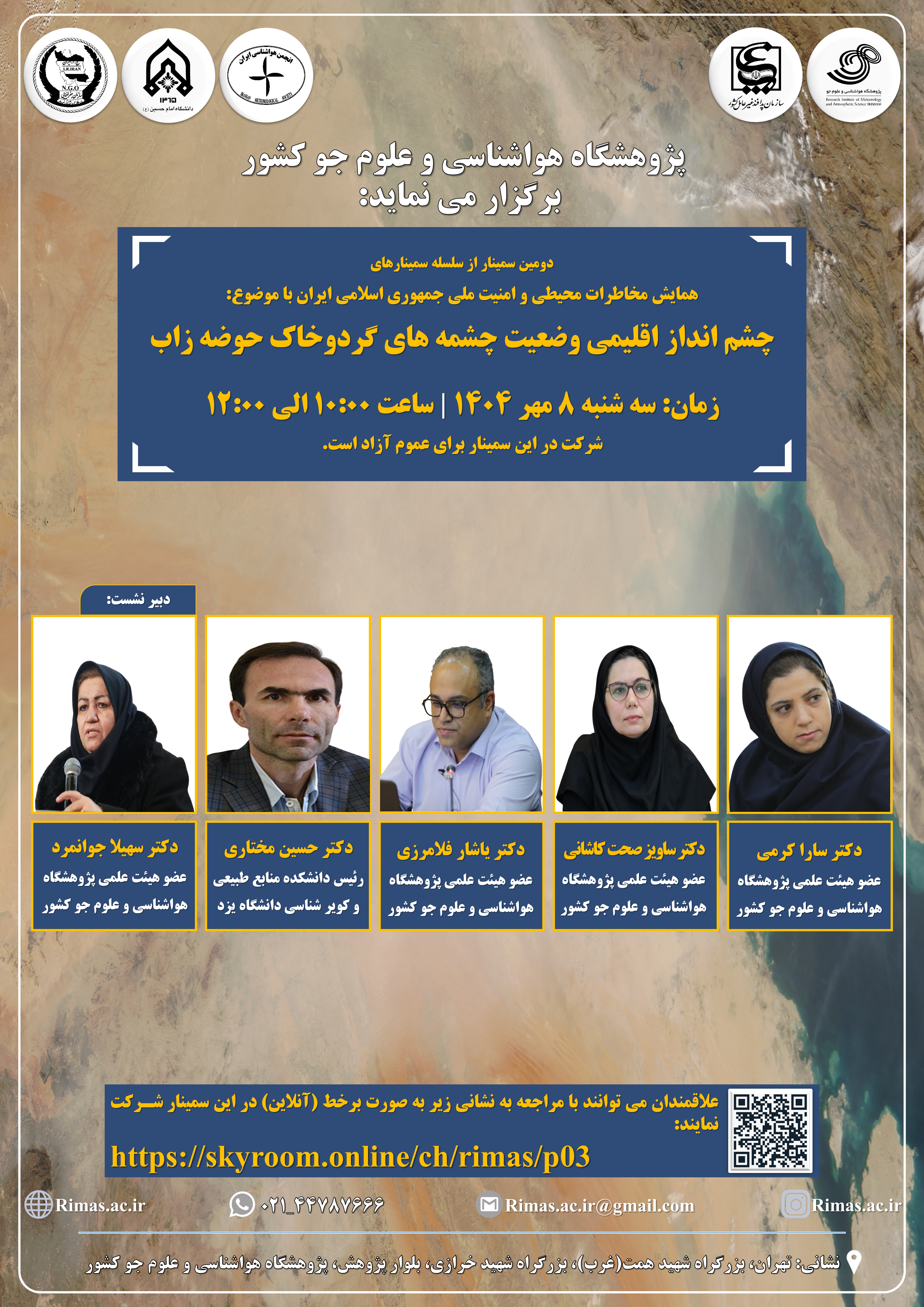 بر اساس برنامه ریزی های صورت گرفته، این سمینار علمی و تخصصی روز سه شنبه 8 مهر ماه سال جاری از ساعت 10 الی 12 به صورت حضوری و مجازی در سالن دکتر هوشنگ قائمی پژوهشگاه هواشناسی و علوم جو کشور برگزار خواهد شد.