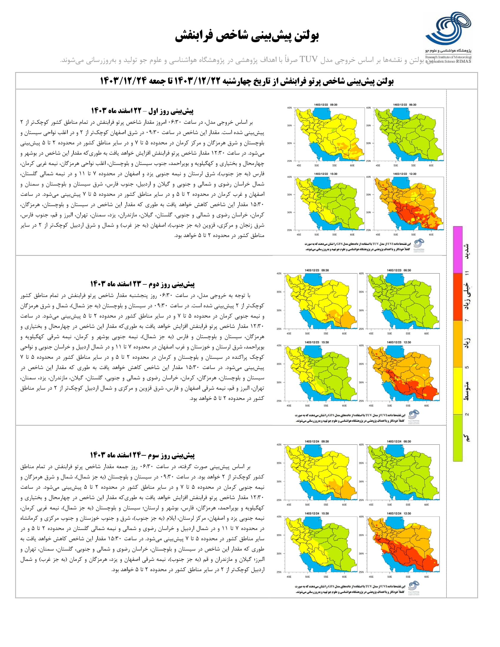 بولتن شماره ۱۷۰ پیش بینی شاخص پرتو فرابنفش ۳ روزه از تاریخ ۲۲ تا ۲۴ اسفند ماه ۱۴۰۳ ۲۲ اسفند ۱۴۰۳ | ۰۸:۱۴ کد : ۱۱۴۵ اخبـــار پژوهشگاه گزارش پیش بینی شاخص پرتو فرابنفش ارسال به دیگران نام شما ایمیل شما ایمیل دریافت کننده ارسال انصراف تعداد بازدید:۱۹۴