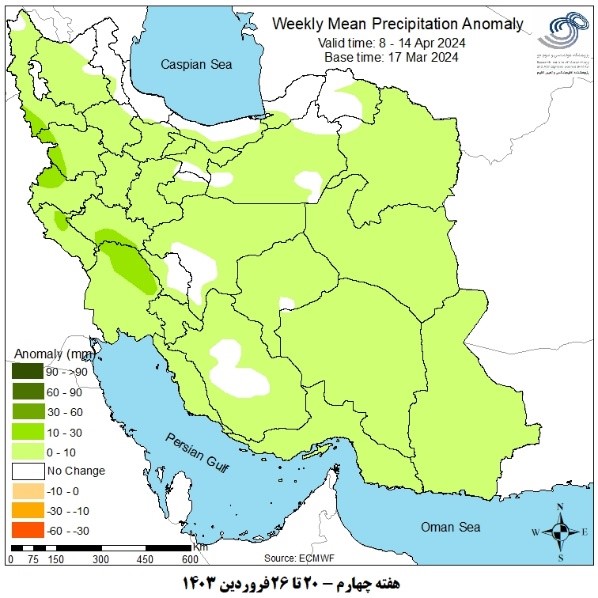 در هفته های سوم و چهارم (13 تا 26 فروردین) بارش کشور بیشتر از نرمال است. بیشترین افزایش در امتداد زاگرس خواهد بود. بارش انباشته این مناطق با احتمال حدود 75 درصد بیش از 50 میلیمتر خواهد بود.