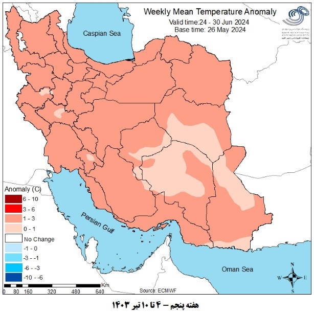 دمای هوا در هفته های پنجم و ششم در جنوب شرق تا 1 درجه بیش از نرمال و برای سایر مناطق 1 تا 3 درجه بیش از نرمال برآورد می شود.