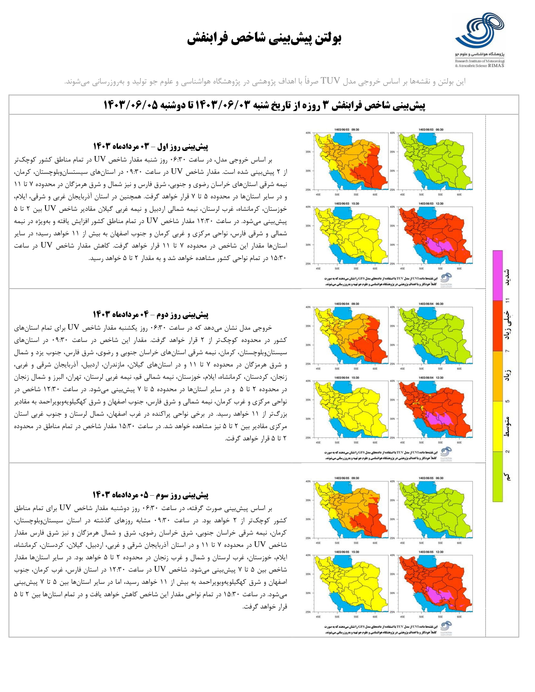 بولتن شماره ۵۰ پیش بینی شاخص پرتو فرابنفش ۳ روزه از تاریخ ۳ تا ۵ شهریور ماه ۱۴۰۳ ۰۳ شهریور ۱۴۰۳ | ۰۹:۱۰ کد : ۷۹۴ اخبـــار پژوهشگاه گزارش پیش بینی شاخص پرتو فرابنفش ارسال به دیگران نام شما ایمیل شما ایمیل دریافت کننده ارسال انصراف تعداد بازدید:۲۳۷